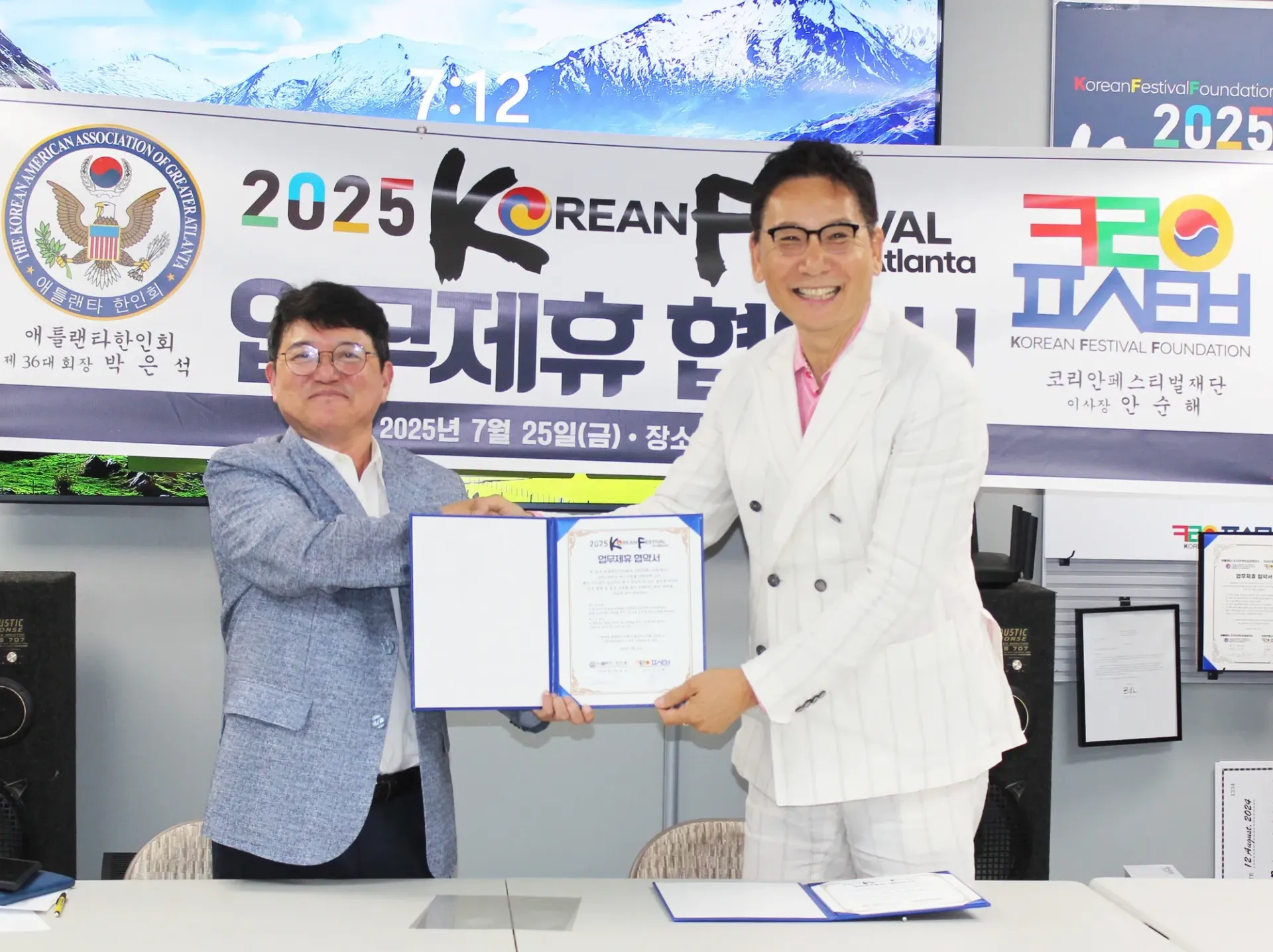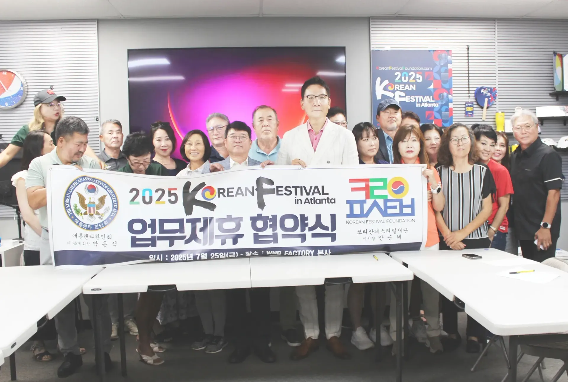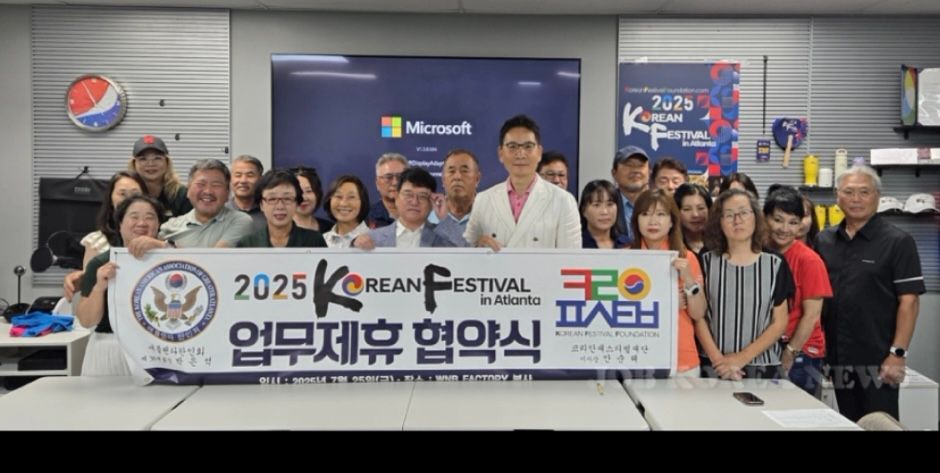 애틀랜타한인회(회장 박은석)와 코리안페스티벌재단(이사장 안순해)은 25일 WNB팩토 리 사무실에서 업무협약(MOU)을 맺고 오는 10월 4~5일 열리는 2025 코리안페스티벌 을 공동주최 및 협력하기로 했다.