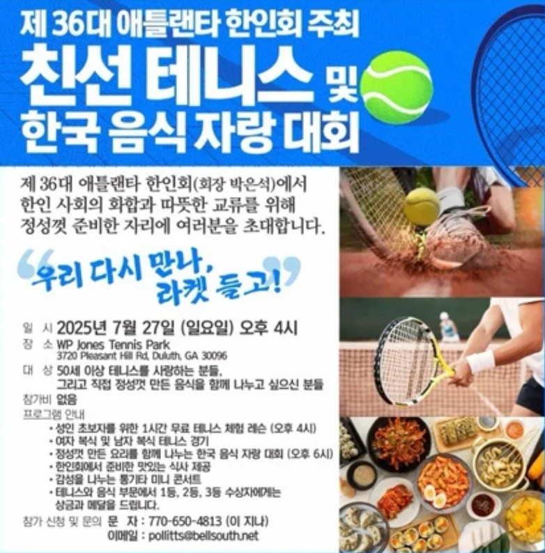 한인회는 오는 7월 27일(일요일) 오후 4시, 둘루스에 위치한 WP Jones Tennis Park(3720 Pleasant Hill Rd, Duluth, GA 30096)에서 '친선 테니스 및 한국 음식 자랑 대회'를 개최한다.